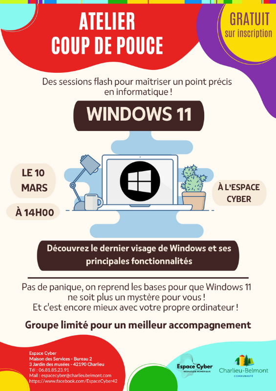 Les ateliers coup de pouce : des "sessions flash" pour approfondir un sujet précis. Au programme : Windows 11, les bases de la tablette, la photo, la gestion de vos mots de passe … et même un atelier spécial généalogie en ligne (en partenariat avec les Archives Départementales de la Loire).