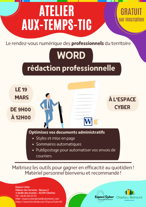 Les ateliers Aux-Temps-TIC : des ateliers thématiques concrets dédiés aux agents (communaux/intercommunaux), aux élus, aux bénévoles d’association et aux professionnels. C'est le rendez-vous pour monter en compétence sur des outils précis comme Word ou les IA génératives, afin de les intégrer dans vos missions quotidiennes.
