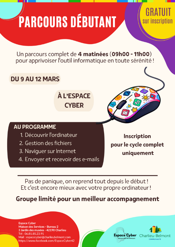 Le parcours débutant (du 09 au 12 mars) : un cycle de 4 matinées pour acquérir solidement les bases de l’outil informatique et de la navigation sur internet. Le cycle complet doit être suivi pour garantir l'acquisition de toutes les compétences de base prévues au programme.